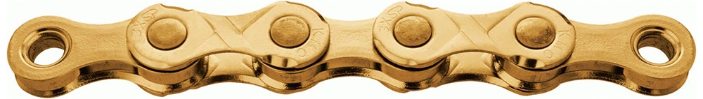 La chaîne extrêmement durable e12 Ti-N 12 vitesses de KMC sans dépendance du sens de marche et avec un revêtement de surface en nitrure de titane doré pour les vélos électriques avec système de changement de vitesse 12 vitesses.