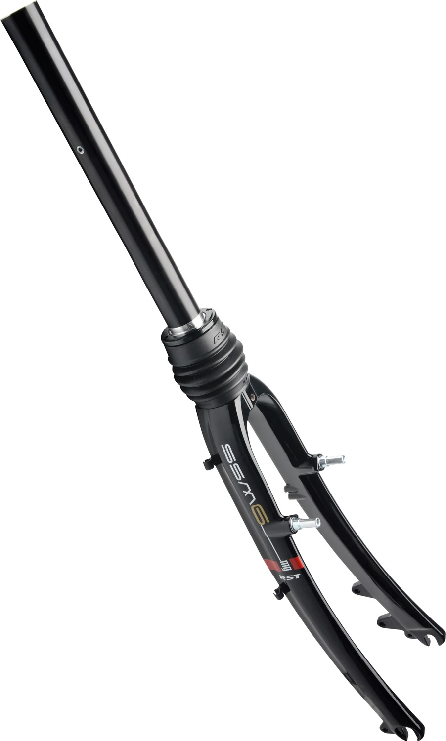 Le monoamortisseur RST M6 26″ avec technologie de suspension intégrée dans le tube de direction est idéal pour les vélos de ville et de trekking. Le ressort en acier offre une course de 35 mm. Il est équipé d’un disque IS2000 ainsi que d’un support de frein sur jante (V-brake).